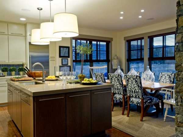 Если у вас есть кухонный остров, то красивый широкий светильник или 3 небольшие лампы над ним станут достойным украшением вашей кухни. Мы говорим один или три, поскольку нечетное число, как правило, является более приятным в интерьере, хотя вы также вполне можете использовать два, четыре или большее количество светильников.