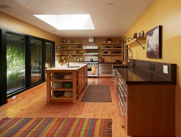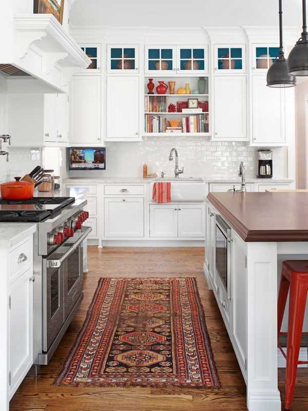Мы часто избегаем ковров на кухне, поскольку эта зона довольно проблематична в плане загрязняемости и ухода. Однако маленький разноцветный коврик можно легко перемещать при вашей необходимости, а кроме того на нем не так сильно будут видны мелкие пятнышки. Прекрасное дополнение для любой кухни!