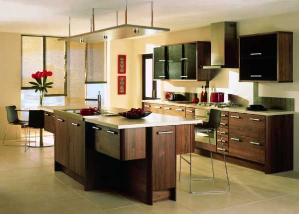 - Для больших кухонь и кухонь с барными стойками и дополнительными «интересными элементами» удачным выбором будет кухня «с островом» посередине. Столешницы, объединённые между собой в геометрическую фигуру, либо барную стойку в кухнях «модерн» размещают в центре кухни. Хоть это и визуально «уменьшает» пространство, но оригинальность и оформление идеи того стоит. Еще один ее вариант «полуостров», что является более компромиссным решением.