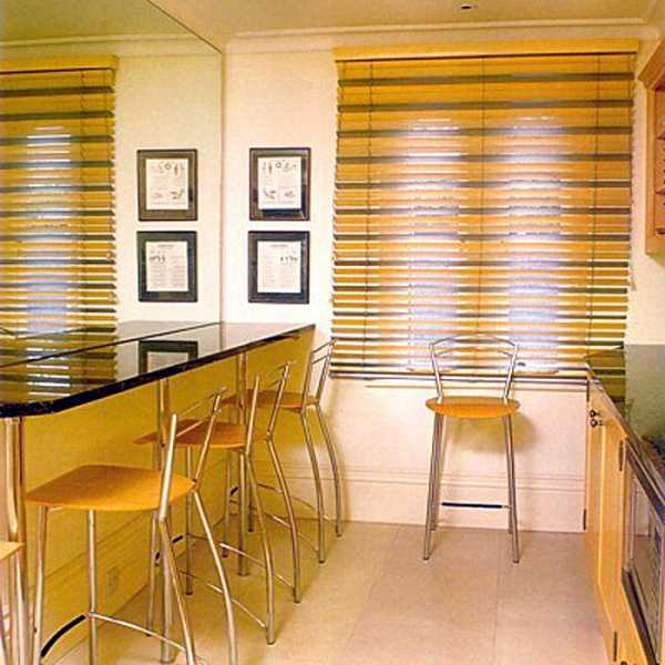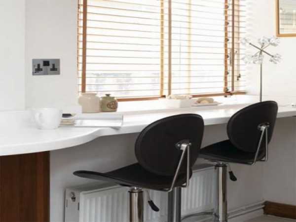 Простая деревянная планка, закреплённая напротив окна-витрины, пара табуретов – это всё, что потребуется для создания исключительно уютной обстановки. Лаконичный вариант идеально впишется практически в любую стилистику интерьера.