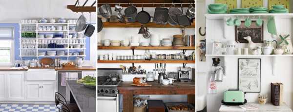 Идеально впишутся в обстановку открытые полки, которые могут располагаться как над напольными шкафами, так и в углу, освобождая дополнительное пространство. Часто можно встреть компоновку кухни без навесных шкафов, такой вариант уменьшает количество места для хранения, но делает кухню визуально более просторной.