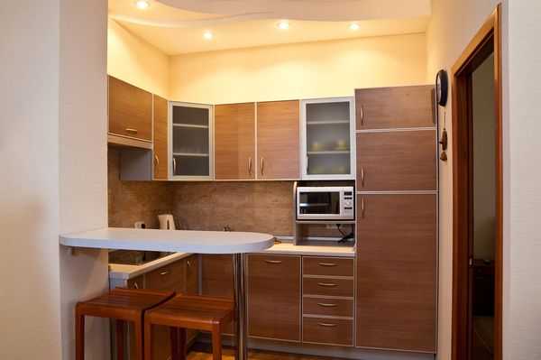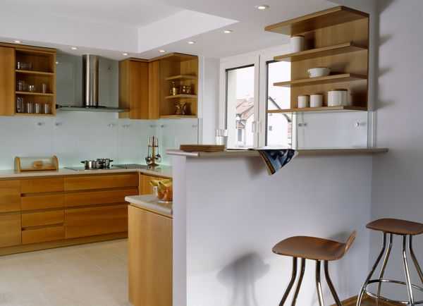 Под барной стойкой вполне удобно хранить различные ёмкости для хранения кухонных принадлежностей, задвигать стулья или табуреты, что высвобождает довольно значительное пространство. Способ обустройства кухни с барной стойкой предпочитают молодые пары, ведущие активный образ жизни.