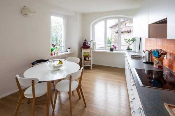 Белый овальный стол на кухне в скандинавском стиле