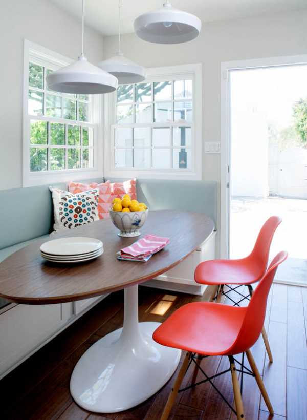 Отсутствие углов в столе можно выгодно обыграть в дизайне кухни