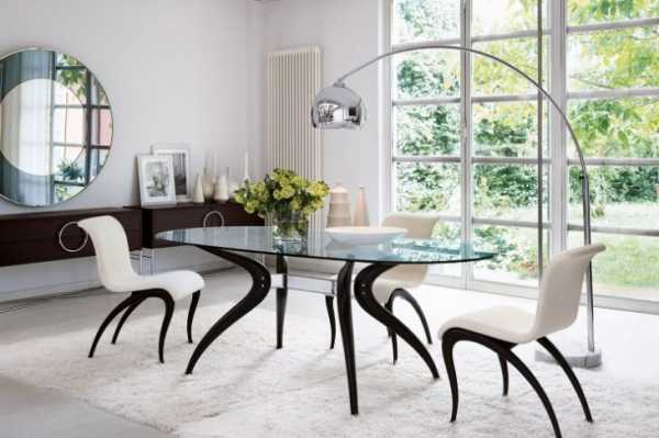 Если уж место и правда приходится экономить, стоит подумать об овальном столе из закаленного стекла с изящными ножками из металла. Стекло, из которого делают такую мебель, не скрадывает, а напротив, визуально расширяет пространство. Складывающиеся столы с поддержкой из подходящих стульев отлично впишутся в стили хайтек и модерн.