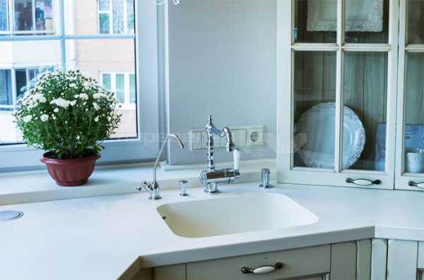 Мойка также выполнена из искусственного камня, но для нее выбрали силгранит, более прочный и стойкий к ударам. При этом за счет продуманного крепления столешница и мойка смотрятся как единое целое.