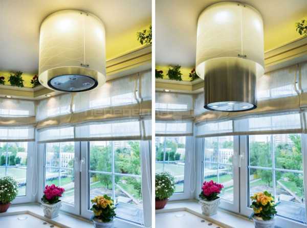 Вытяжка необычная, она спускается с потолка, и сам механизм убран в стеклянный “футляр”. Выглядит такая вытяжка как потолочная люстра.