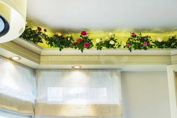 Подсветка организована в два яруса: нижний образован встроенными в карнизы светильниками. Они освещают цветочную кухню направленным светом из пятнадцати точек. Верхний обеспечивается светодиодной лентой, заложенной за карнизы. Он обеспечивает эффект “поднятия” потолка и зрительное увеличение объема комнаты.