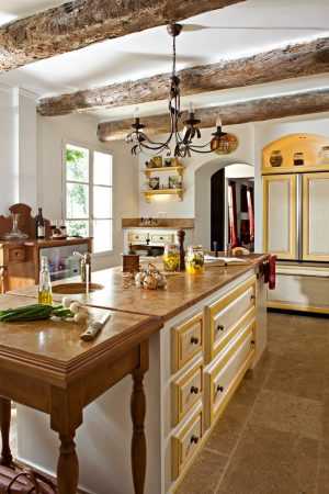- Потолок окрашивается белым или чуть более светлым. Его лучшее украшение – деревянные балки, настоящие или имитация. Причем «дерево» для балок может быть темным. В столовой потолок может обойтись и без них.