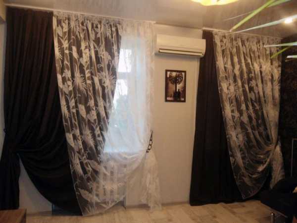 На восприятие штор темного цвета в помещении не малое значение оказывает и ткань, из которой сшиты шторы. Тяжелые ткани (парча, бархат, велюр) зрительно нагружают помещение. Поэтому чтобы придать немного легкости и некой романтичности, можно такие ткани сочетать с более легкими или комбинировать темную ткань со светлой.
