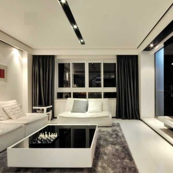 В дополнение к ним можно разложить на светлом диване подушки с темными чехлами или постелить возле дивана небольшой темный ковер с длинным ворсом. Примером такого сочетания светлых и темных цветов, может стать черно-белая гостиная, когда белый выступает доминирующим цветом, а черный – это акценты в виде штор, аксессуаров, небольших предметов мебели (журнальный столик, комод).
