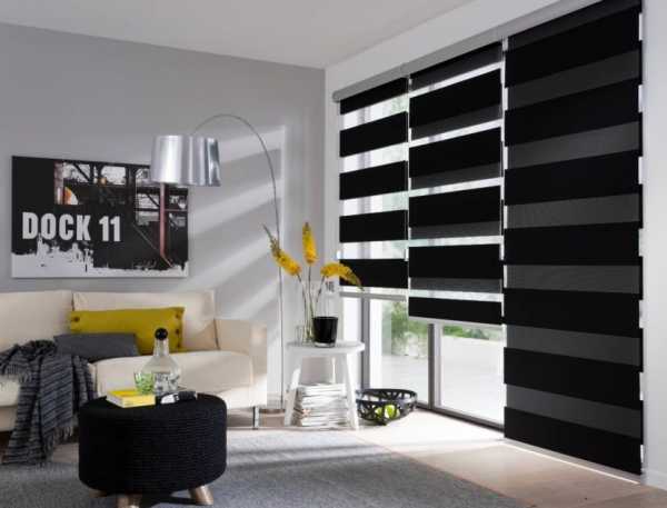 Однако если стиль всей квартиры или дома диктует свои условия, то эти цвета можно сочетать в полоске с черным цветом. В таком случае дизайн черных штор можно подобрать к любому цветовому решению.