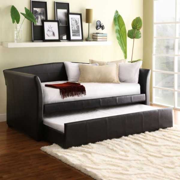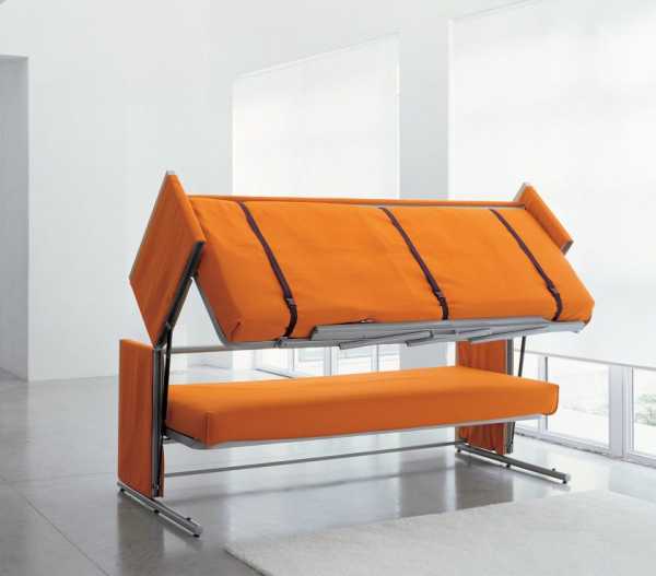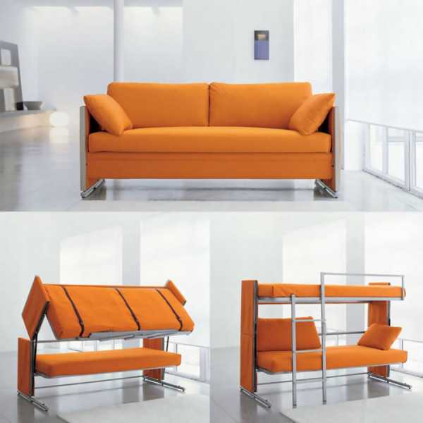 Довольно интересное дизайнерское решение, специально созданное для небольших комнат — это двухъярусный диван трансформер, который отличает удобство при раскладывании и возможность одновременно отдыхать на нем нескольким людям одновременно. К тому же такая конструкция дивана не занимает много места.
