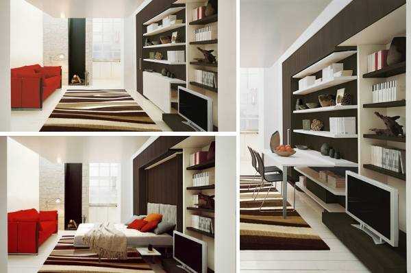 Мебель трансформер, представленная в нашей первой серии фото, пользуется особой популярностью среди владельцев малогабаритных 1-комнатных квартир, но также может применяться и в любом другом жилище, где не хватает отдельных комнат. Раскладной шкаф-кровать и диван-трансформеры могут заставить один интерьер выступать сразу в роли спальни, гостиной, столовой и домашнего офиса.
