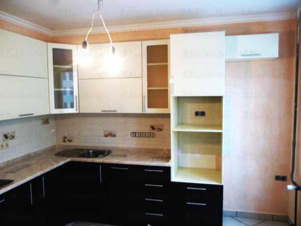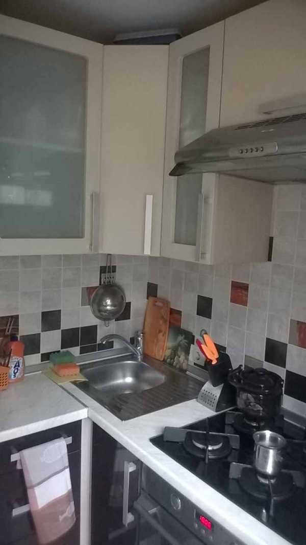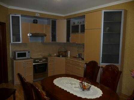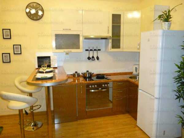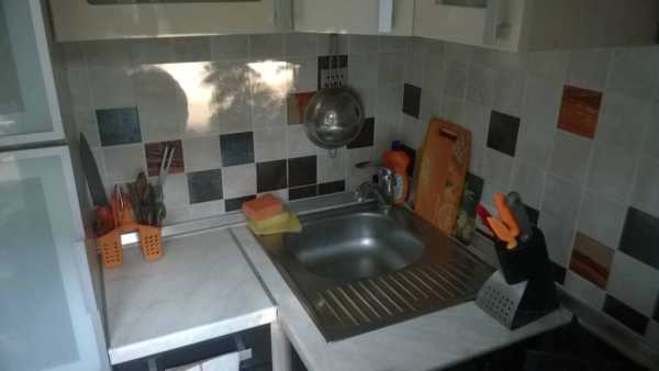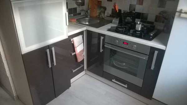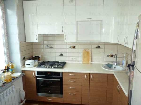 Вы наверное уже заметили по фотографиям, что кухонный гарнитур имеет компактную угловую планировку. Для маленькой кухни 5-7 квадратных метров, которые так часто встречаются в «хрущевских» квартирах угловой кухонный гарнитур наилучшее решение, ведь помимо самого кухонного гарнитура, нужно было предусмотреть место, для маленькой обеденной зоны рассчитанной на две персоны.