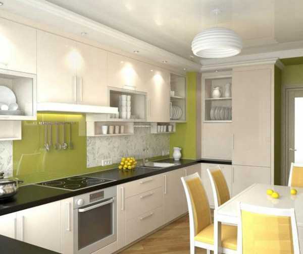 Самый распространенный прием для маленьких кухонь, сделать гарнитур на всю возможную высоту, так он станет вместительней. Эта небольшая хитрость, заметно увеличивает внутреннюю площадь самого гарнитура. Между потолком и навесными шкафчиками, сделан небольшой отступ, в 10 см, необходимый для газовой трубы.