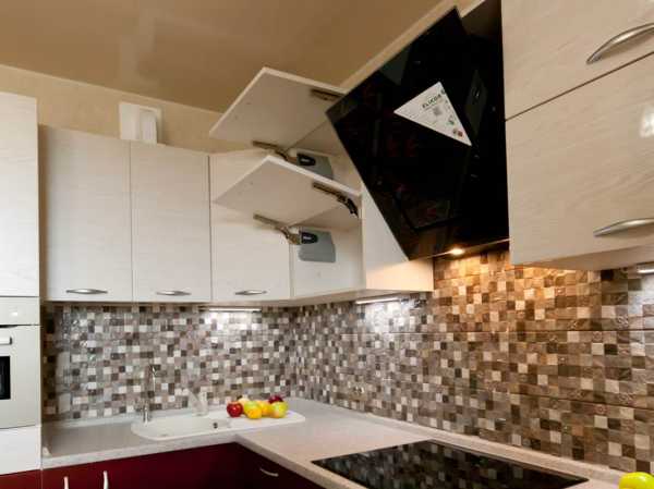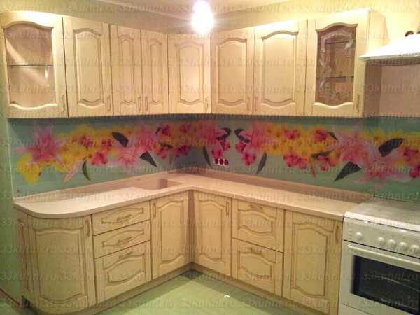 Стеновая панель выполнена мозаикой, что сочетается с пластиковой столешницей имитирующей гранит и самой кухней в цвете беж. В углу размещена прямоугольная мойка накладного типа. Сверху скрыта в подвесном шкафу итальянская сушка Inoxa.