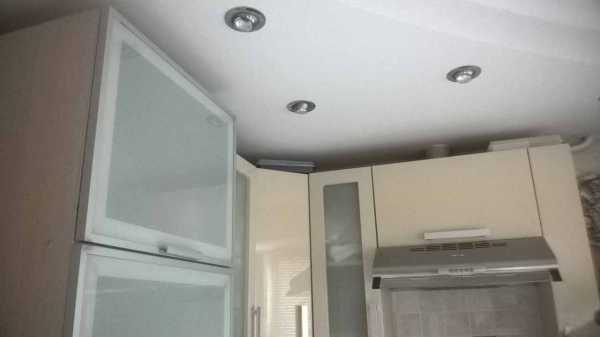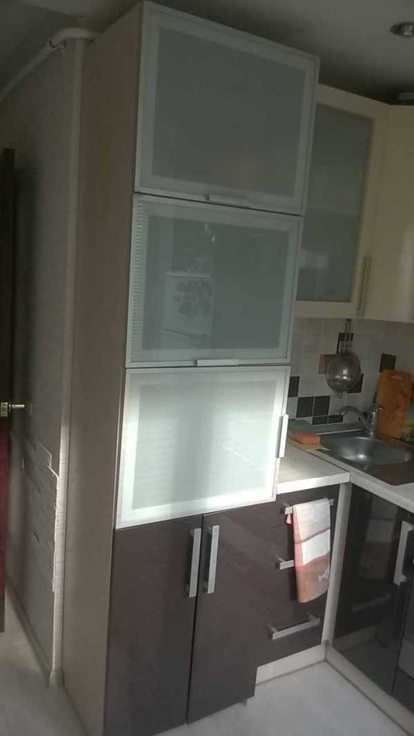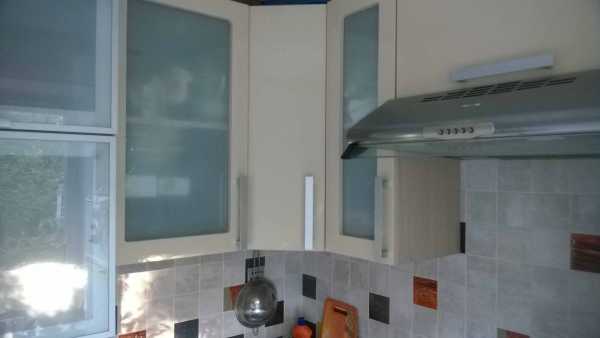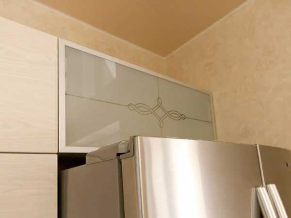 По желанию хозяев, в углу прямо над холодильником сделан навесной шкафчик с матовой стеклянной дверью.