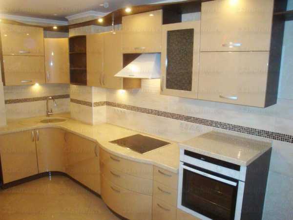 Получившаяся кухня в бежевом, объединяет современный стиль с элементами применяемыми в классических направлениях. Например, торцевой модуль слева декорирован фигурными балясинами, такое решение можно встретить в стиле прованс.