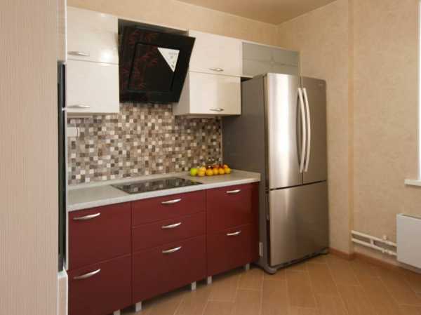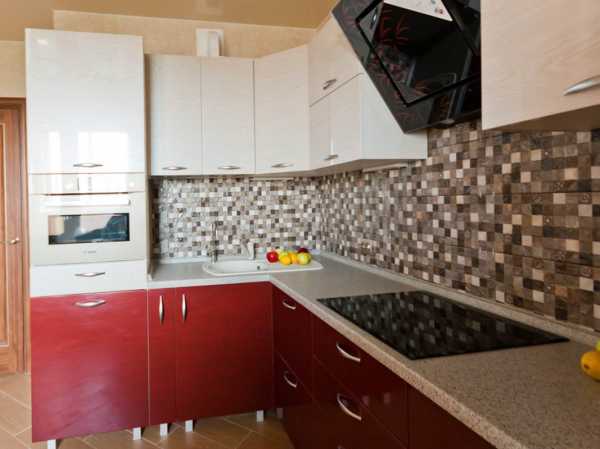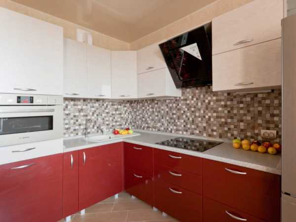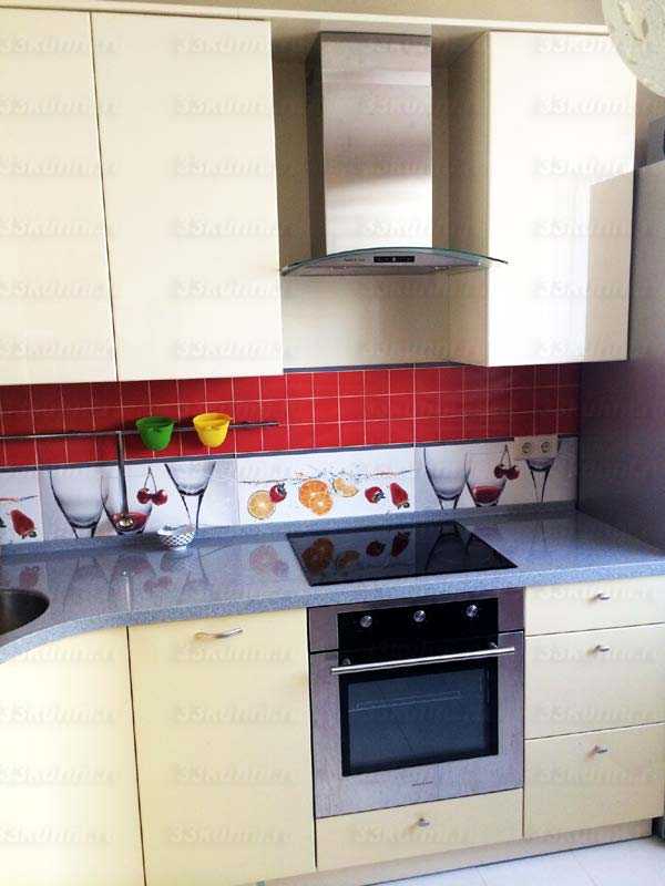 Небольшая двухцветная угловая кухня площадью 9 кв.м с красно-бежевыми фасадами