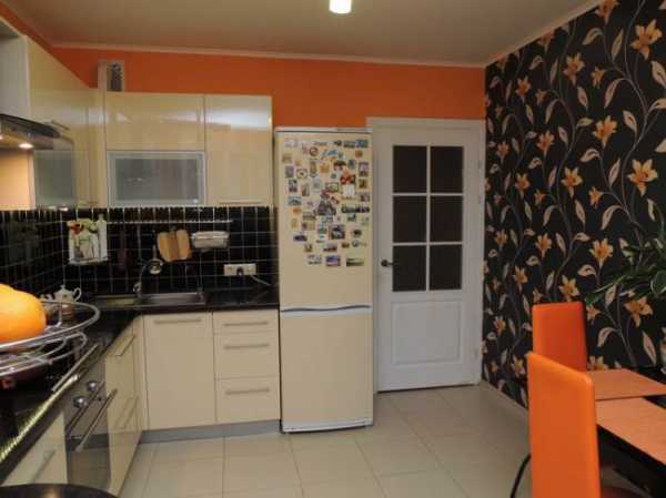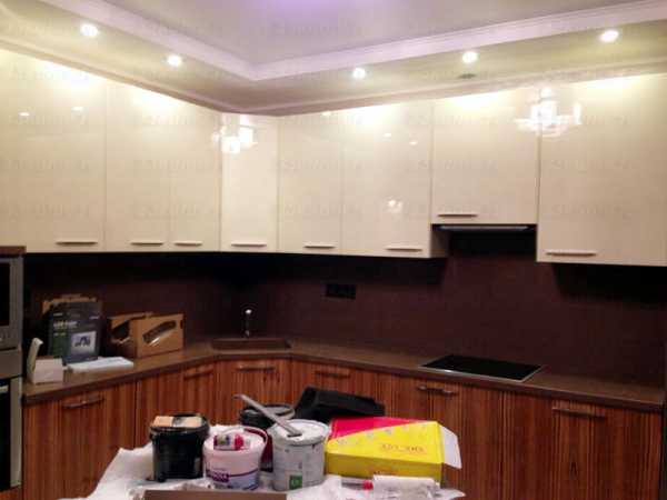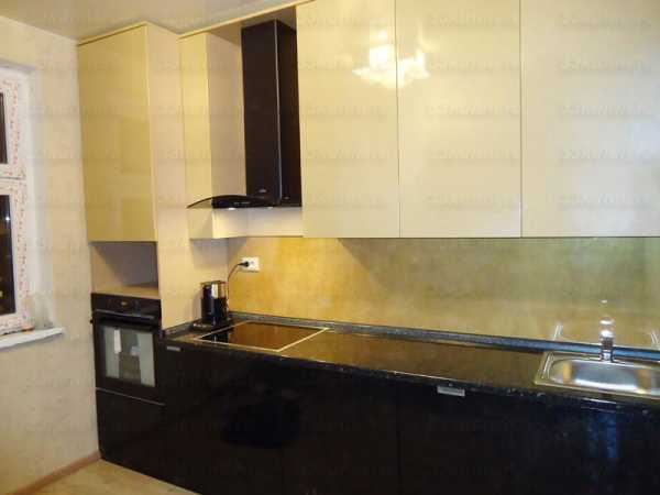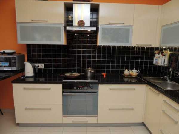 Первое что бросается в глаза — это чёрная глянцевая поверхность столешницы и такой же черный фартук. Столешница изготовлена из постформинга, толщиной 38 мм, покрыта чёрным глянцевым термостойким пластиком. Такие столешницы легко переносят горячую посуду. Бежевый легко сочетается с разными оттенками и цветами в том числе и чёрным, что хорошо видно на этих фотографиях.