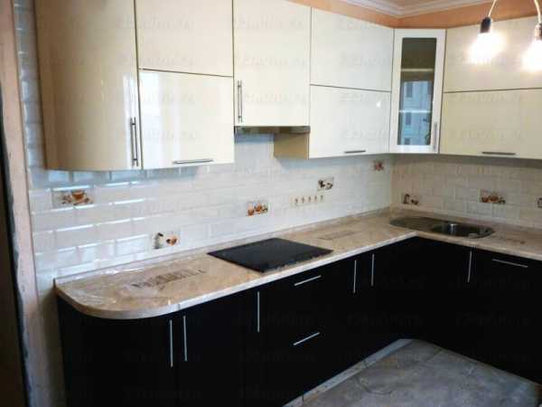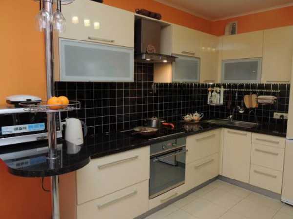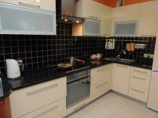 Черная глянцевая столешница в бежевом гарнитуре смотрится оригинально