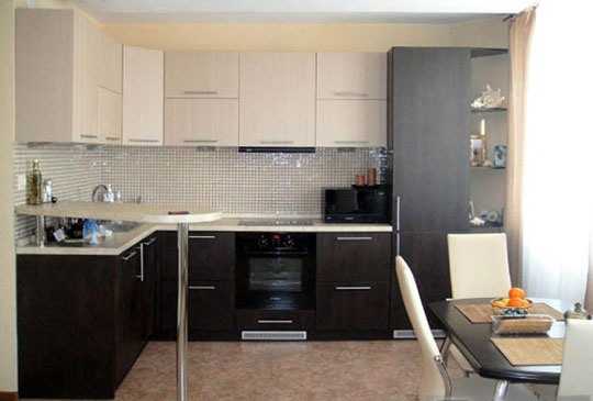 Маленькая угловая бежево-коричневая кухня в хрущёвке