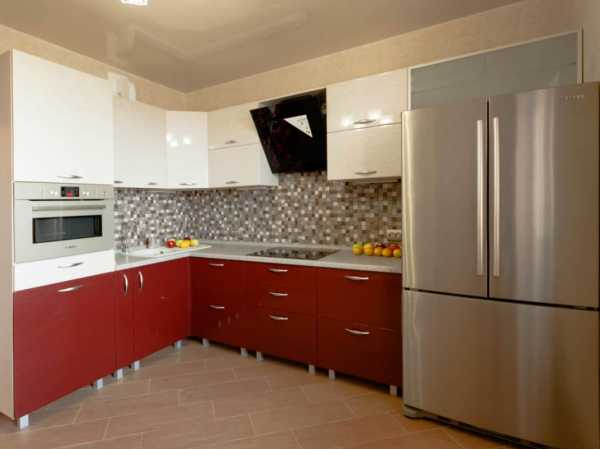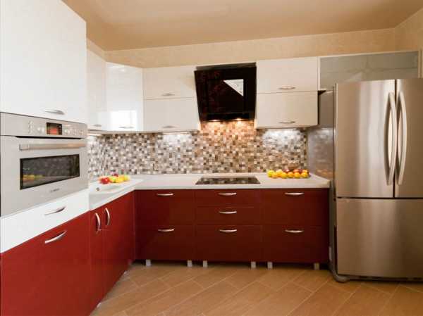 Красно-бежевая угловая кухня с глянцевыми крашеными фасадами