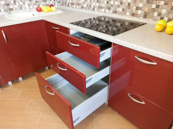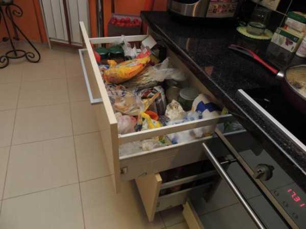 Очень удобно и практично, то что все нижние шкафы, за исключением одного, который находятся под мойкой, сделаны выдвижными ящиками. Трудно придумать более удобный способ хранения. Ящики легко открываются и закрываются, незачем вставать на колени и копаться где-то внутри глубоко шкафа, просто выдвинул ящик и всё перед глазами, бери то что нужно.