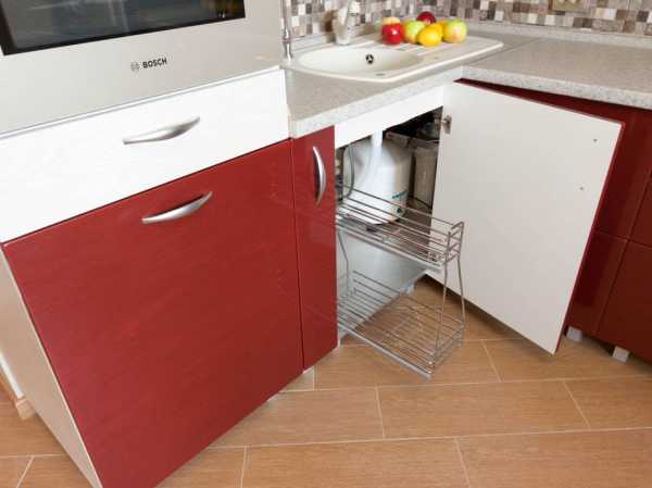 Существует много видов бутылочниц или выкатных корзин. Они могут быть как отдельным ящиком, так и встраиваться внутрь шкафа. В данном случае прямо под мойкой, находится выкатная корзина для бытовой химии.