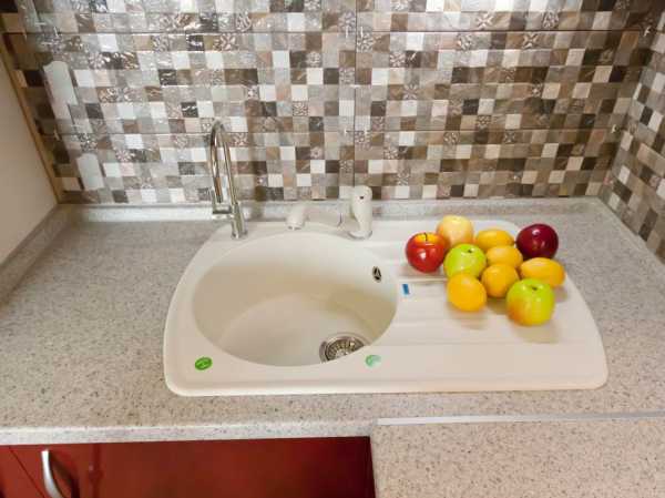 В столешницу врезана светло-бежевая мойка, с так называемым правым крылом или дополнительной поверхностью. Мойка небольшая но достаточно глубокая и вместительная. В самой мойке установлены два крана, один основной, подключенный к водопроводу. Во втором маленьком кране, бежит уже отфильтрованная через фильтры вода.
