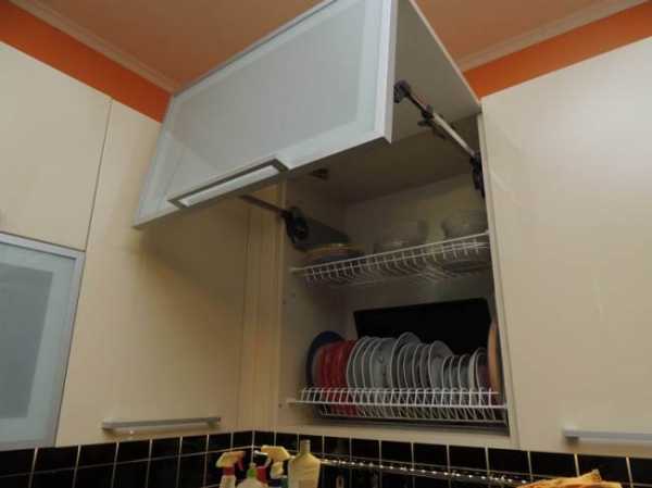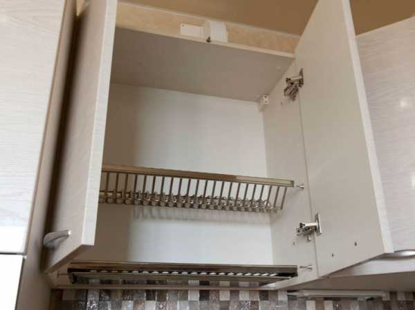В шкафчик для посуды установлена сушка из нержавеющей стали, как и полагается в таких случаях в самом шкафчике дно отсутствует, так посуда будет быстрее высыхать. Посудный шкафчик чаще всего располагается над мойкой или рядом, для того чтобы не нужно было далеко тянуться.