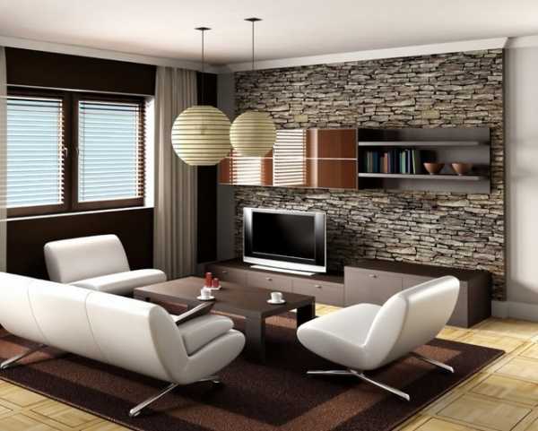 Стильно украсить интерьер гостиной можно при помощи отделки одной стены искусственным камнем