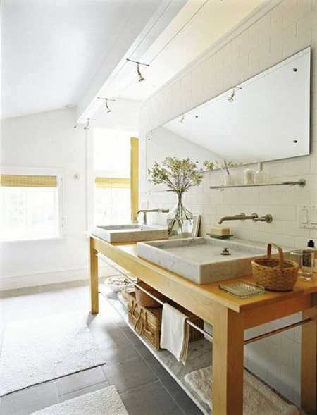 - применение двуцветной плитки (например, серой и белой)и деревянной мебели;