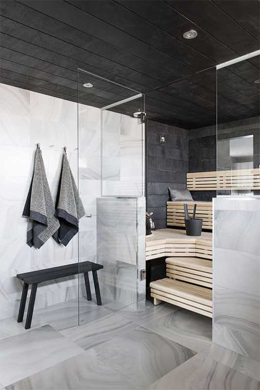 Размещение в ванной комнате собственной сауны – безусловно, одна из самых сложных в реализации идей из представленных здесь. Но именно это позволит наиболее отчетливо почувствовать дух Скандинавии, и тогда вы поймете, что игра стоит свеч.