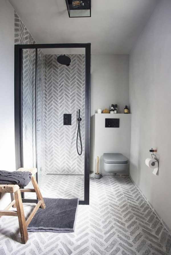 Вместо душевой кабины можно обустроить отдельную нишу вдоль одной из стен, отделив ее стеклянной перегородкой. В итоге мы получим гораздо больше места. Кроме того это подчеркнет геометричность пространства и его упорядоченность. Унитаз с бачком скрытого монтажа поможет соблюсти минималистичность интерьера. Это эргономичное и современное решение.