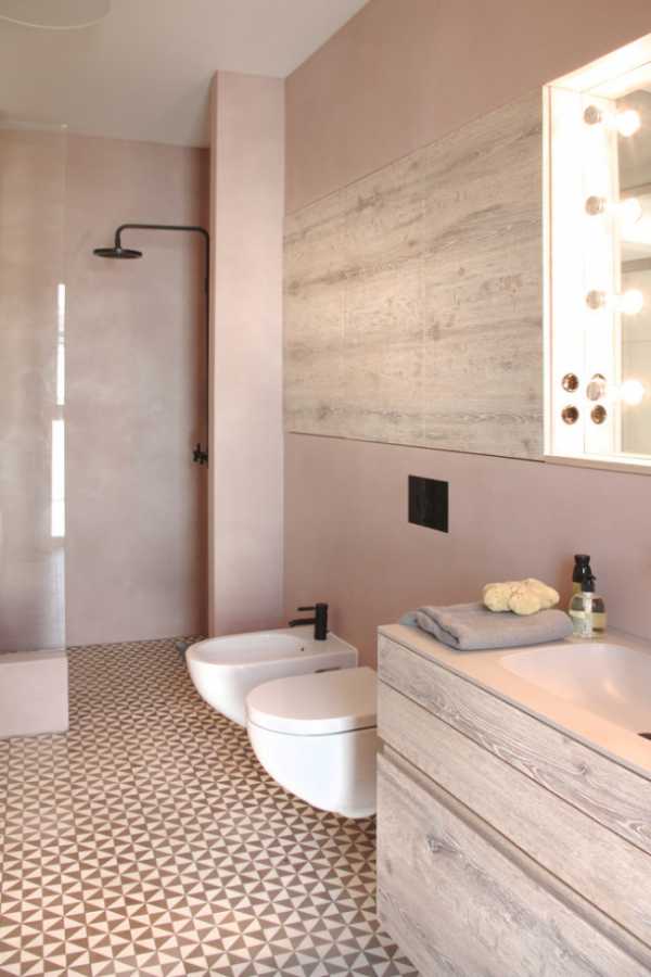 В последние годы преобладающий белый цвет, характерный для скандинавского стиля, постепенно вытесняется более мягкими пастельными и бежевыми оттенками. Если некоторые из них, такие как персиковый, серый или серо-коричневый, в плитке и краске для стен объединить с белоснежной сантехникой и такой же деревянной мебелью, вы преуспеете в создании лаконичного вида.