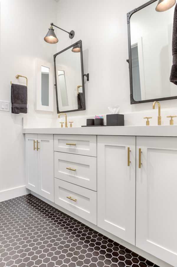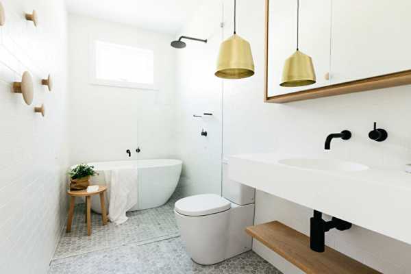 Использование черно-белой графики – излюбленный прием дизайнеров, специализирующихся на скандинавском стиле. Особенно эффектно она смотрится на фоне более теплых элементов дизайна, таких как светлая древесина и латунные смесители. Дизайнеры из Auhaus Architecture сделали довольно смелый, но, в конечном счете, правильный выбор напольного покрытия с черно-белым геометрическим рисунком, в результате подарив хозяевам этого современного дома в Мельбурне очень сложный, фактурный и, главное, уникальной вид ванной комнаты.