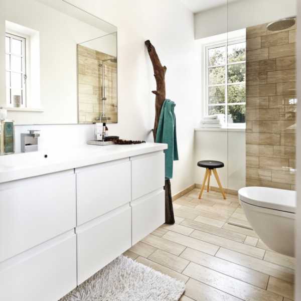 Хитрым способом привнести в ванную комнату теплые древесные оттенки является использование плитки «под дерево». Она обладает всеми достоинствами кафельной плитки, но внешне напоминает деревянные панели. В приведенном на фотографии примере подобная плитки «под дерево» использовалась для покрытия пола и стены за ванной.