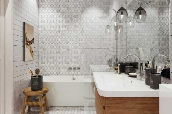 Шестиугольные плитки становятся все более популярными в современных скандинавских ванных комнатах. Стена, украшенная подобными шестигранниками, выглядит очень эффектно. Еще более поразительная картина получается, когда белая шестиугольная плитка используется в сочетании с черной контрастной затиркой или с ней соседствует более мелкая плитка на полу.
