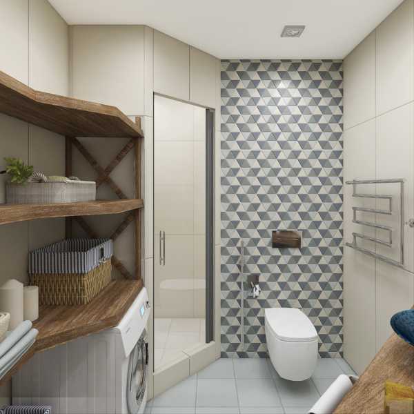 Отказаться от ванной в пользу душа — будет практичным решением для малогабаритки. Вместо шкафчиков с фасадами — открытые полки. Большие зеркала и глянец визуально добавят объема комнате.