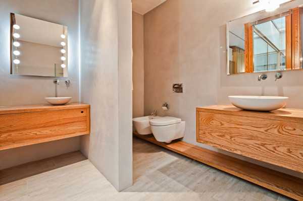 Для экономии площади и создания эффекта невесомости в помещении используются подвесные раковины, унитазы, биде. Сантехнические элементы обычно изготовлены из металла, который плавно вплетается в естественную атмосферу ванной комнаты.