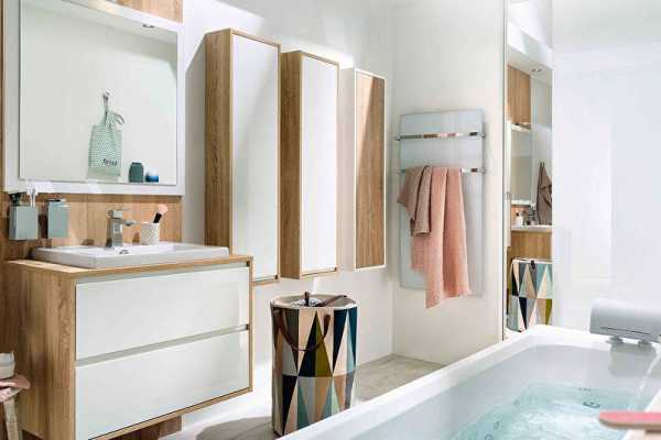 Мебель и оборудование могут комбинироваться, например, умывальник здесь можно повесить над ванной, а стенной навесной шкаф разместить над полотенцесушителем