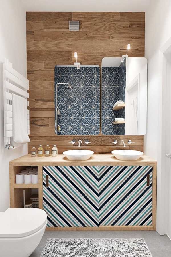 Дерево и декоративные элементы с оформлением «под дерево» не только привнесут в дизайн данного помещения естественную нотку, но и создадут впечатление теплоты и уюта, для этого можно использовать мозаику. Она придаёт помещению необычный внешний вид. Например, мозаикой можно оформить зону над умывальником.