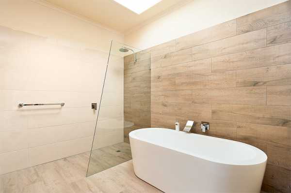 В просторных ванных комнатах можно комбинировать плитку с другими материалами. Например, покрыть стены штукатуркой или деревянными панелями в области с меньшим уровнем влажности. Для встроенной душевой кабины нередко используют мозаику.