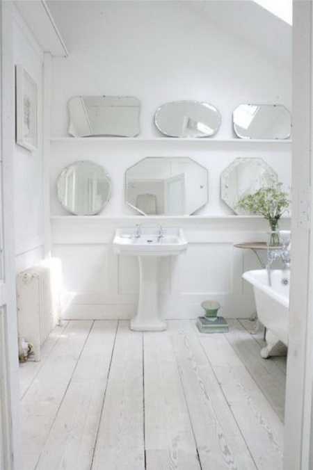 Так, одним из приёмов можно назвать использование в помещении ванной минимального числа предметов мебели. Мебель и оборудование могут комбинироваться, например, умывальник здесь можно повесить над ванной, а стенной навесной шкаф разместить над полотенцесушителем. В обязательном порядке в помещении нужно будет размещать зеркала и блестящие поверхности, использовать при оформлении светлые тона.