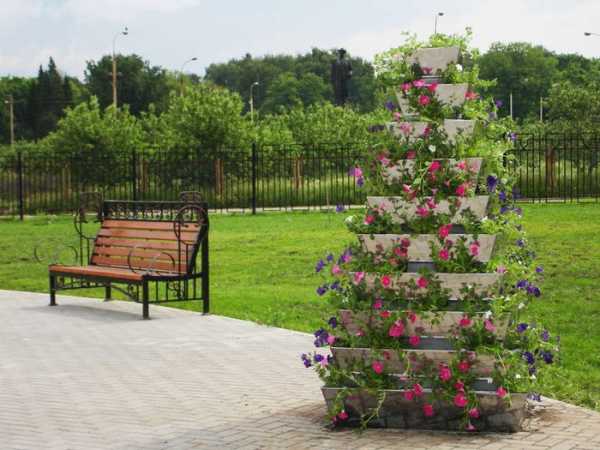 Создать вертикальную клумбу можно из готовых садовых емкостей или соорудить пирамидальную конструкцию из имеющихся в наличии досок. Для озеленения гармонично подойдут: