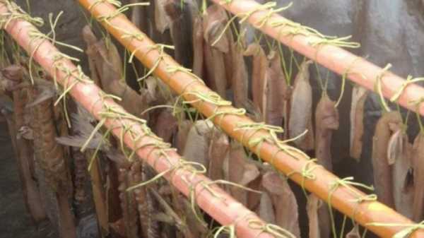 На крюках развешивают рыбу, узкие полоски сала или мяса, после чего сверху до середины конструкции натягивают мешок. На дно ближе к центру высыпают полведра горящих углей, которые сразу нужно накрыть свежей травой или березовыми или вишневыми листьями. После мешок надевают до конца, а его края закрепляют на земле для максимальной герметичности.