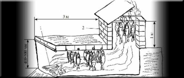 Коптильня в земле. Роется яма. В ней должны уместиться несколько слоев: слой углей, поверх него слой свежих веток, на 10–15 см выше будет располагаться сетка или шампуры с продуктами, и должно оставаться еще сантиметров 10 до поверхности земли. Все это будет укрываться брезентом или другой плотной тканью. Размер камеры в земле зависит от вашего желания. В итоге, внизу разжигается костер, потом туда насыпаются угли или ветки, которые должны тлеть (надо следить, чтобы не было открытого огня), выше ставится решетка или шапмуры втыкаются в стены ямы. Сверху коптильня укрывается брезентом или другой плотной тканью. Цель укрытия — не давать огню разгореться. Чтобы костер совсем не погас, изредка можно приподнимать полог.