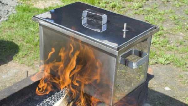 Коптильня из бака. Нужен бак из нержавеющей стали, покупной или даже самодельный. На улице под него ставят газовую или электрическую плитку, на нее — бак. Внутрь бака помещают щепки, угли, чурбачки деревьев, в верхней части подвешивают мясо или рыбу. На дрова можно положить толстую фольгу или лист металла, чтобы жир от продуктов не капал на тлеющие дрова и не создавал копоть. Также можно у бака вырезать дно и поставить его на емкость с углями, которые будут тлеть.